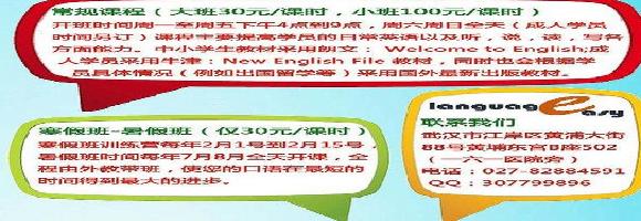 我们有最先进的教学设备,是武汉首家采用3D科技教学的教育机构,视觉上的震撼能让孩子更加快乐的学习英语。我们采用的多种方式进行授课,除了传统的课本我们还有专门设置讲故事,游戏和主题活动等授课环节以及免费在线复习课和周末英语角,同时我们还给学生配备掌上可视电脑,课上课下随时说英语!我们的主要教材是朗文longman: welcome to English!小班教学,因材施教。经营地址:湖北省武汉市江岸区黄浦大街黄埔东宫